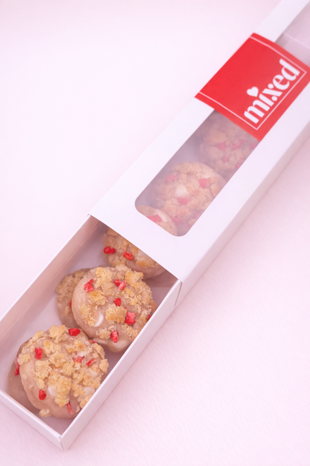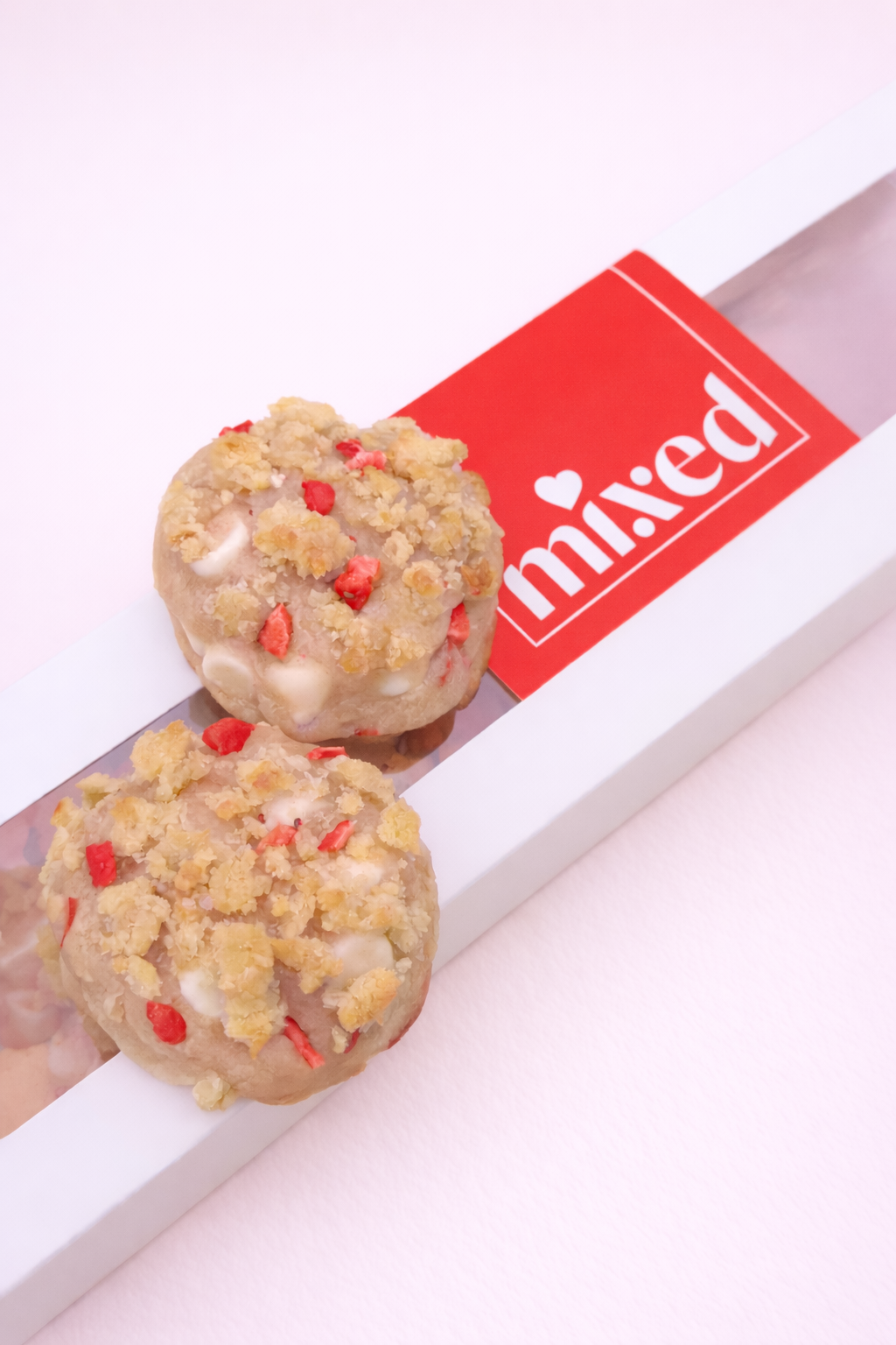 A nostalgic take on the classic strawberry shortcake ice cream bar, inspired by my Zeydi’s favorite treat growing up. This soft vanilla-strawberry cookie is filled with creamy white chocolate chips and crushed freeze-dried strawberries, then topped with our homemade shortcake crumble for the perfect sweet crunch.