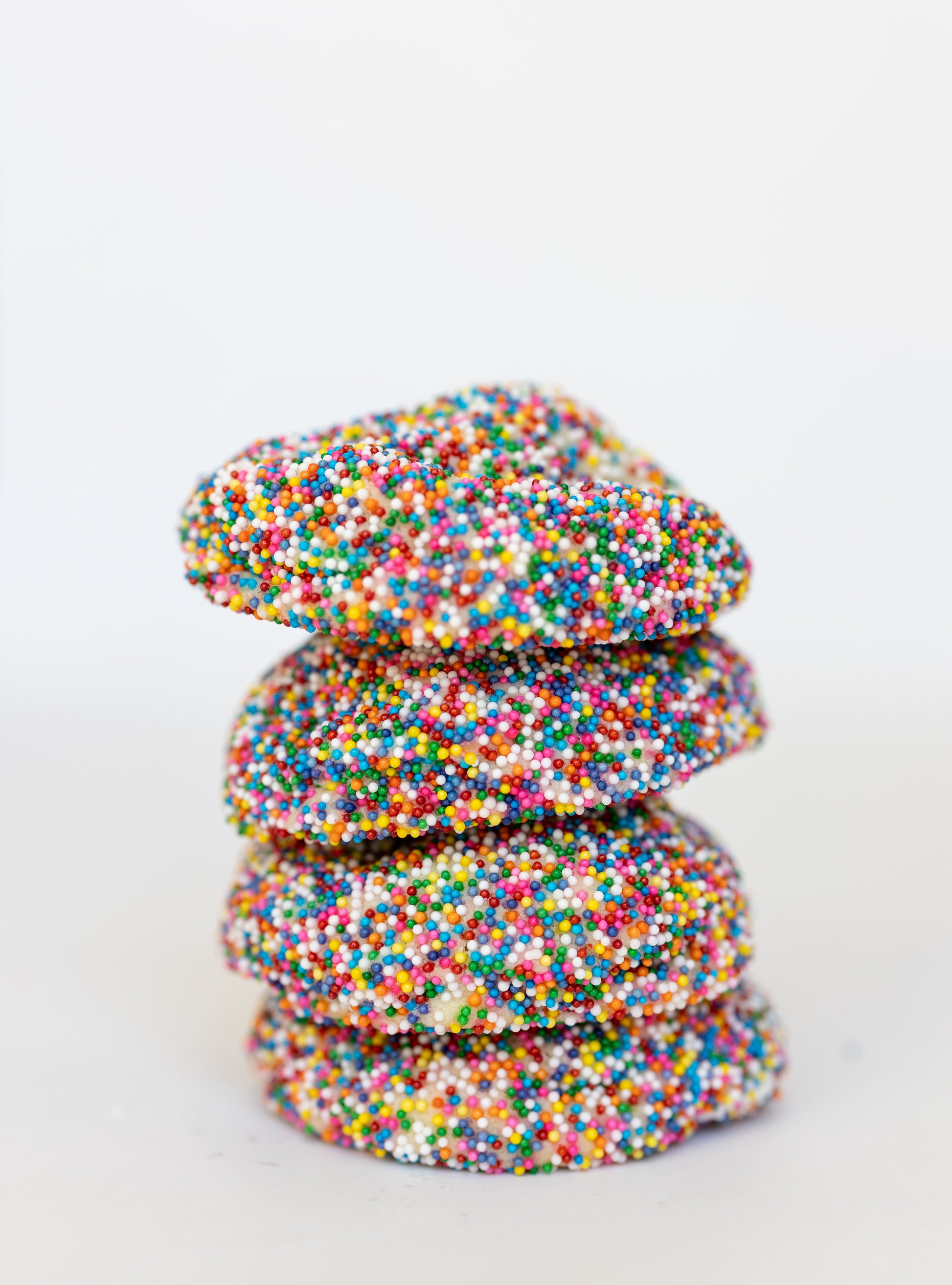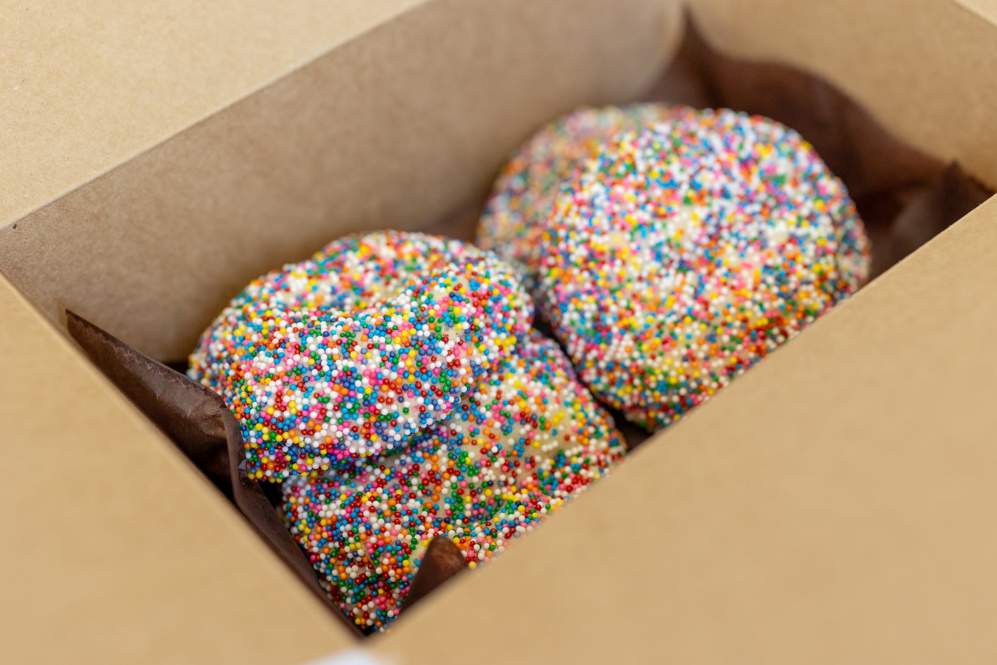 Sprinks - A fresh take on a childhood classic. Our homemade, soft buttery sugar cookie is coated in a vibrant layer of crunchy sprinkles, bringing back those iconic deli vibes with every bite. It’s the perfect blend of nostalgia and flavor, ready to brighten your day.